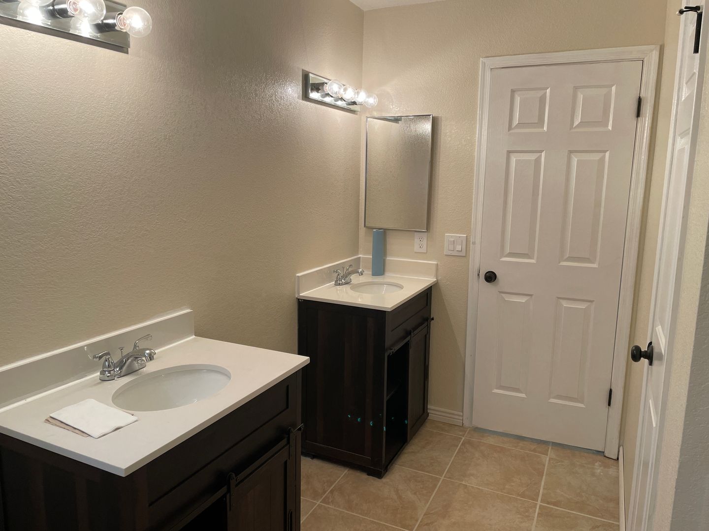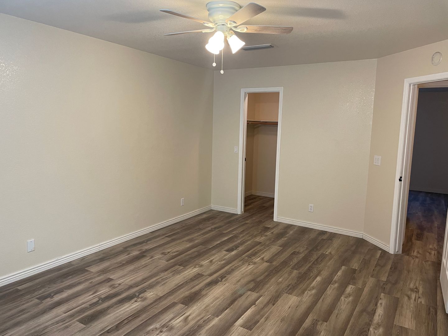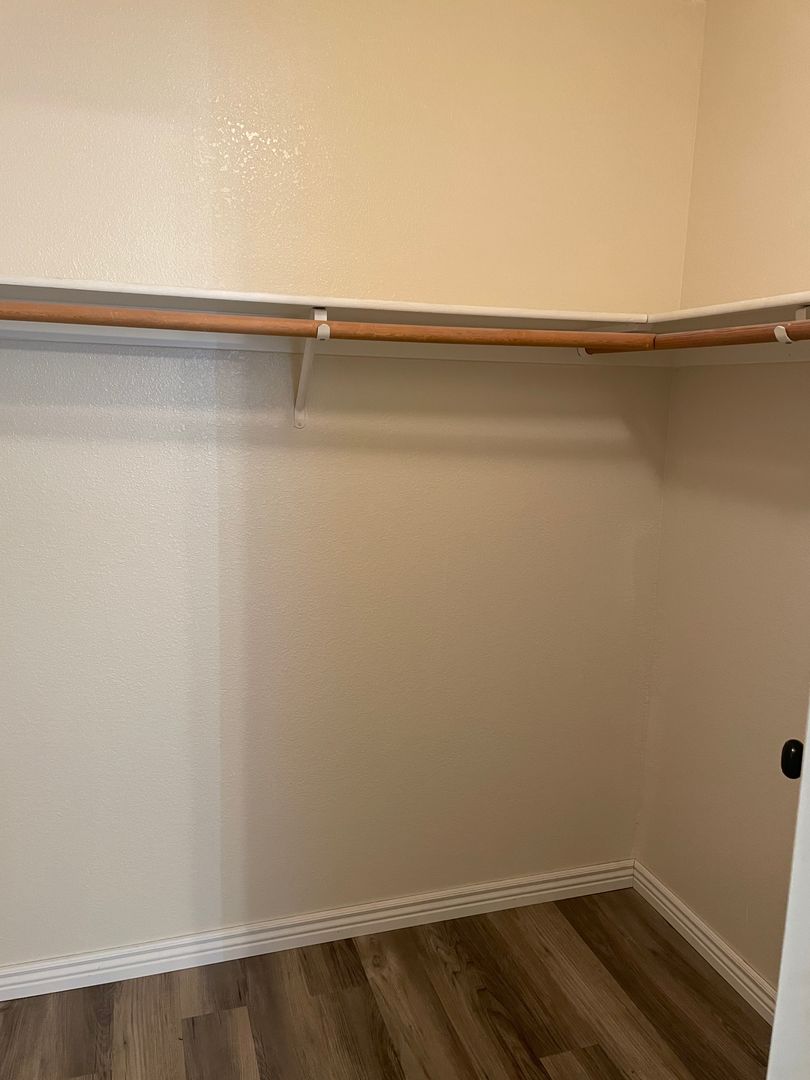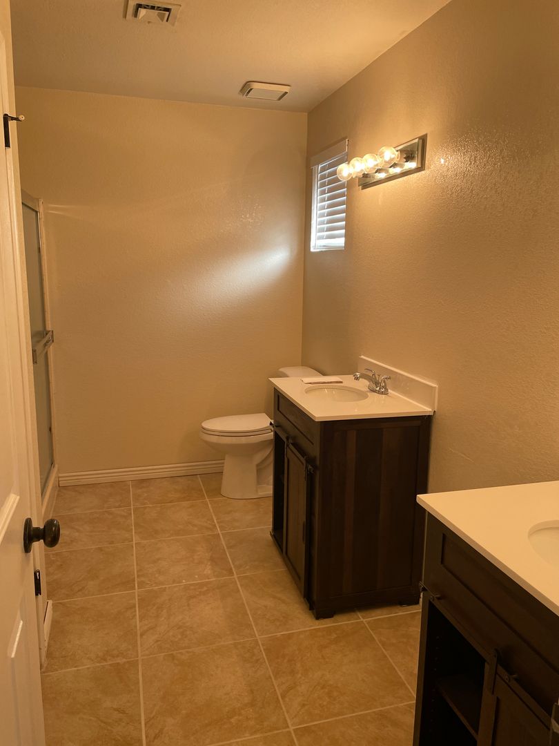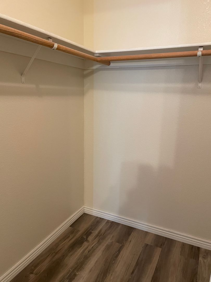 The master bedroom offers a spacious walk-in closet and an en-suite bathroom with dual vanities and a walk-in shower. The hall bathroom includes a new vanity, a linen closet, and a tub/shower combo. The galley kitchen is equipped with a glass-top stove.